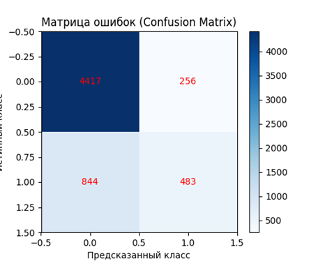 Для более детальной оценки полученных результатов была построена матрица ошибок, где по осям указаны истинные метки (0/1) и предсказанные моделью (0/1). Визуальное представление матрицы показано на Рисунке 2, из которого видно, что наибольшее количество ошибок приходится на неправильное определение дефолта у клиентов, которые, по сути, являются единичным классом (дефолт).