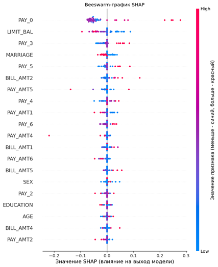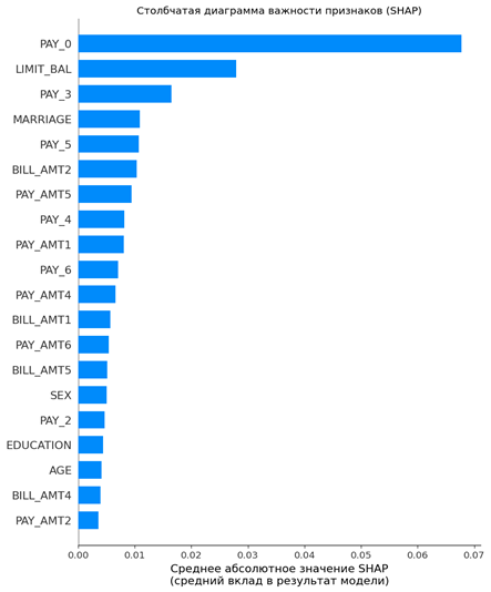 На Рисунке 4 показана столбчатая диаграмма с средними абсолютными значениями SHAP, позволяющая понять, какие признаки в целом наиболее сильно влияют на решения сети. Выяснилось, что главными факторами оказались признаки, связанные с историей просрочек (PAY_i), лимитом кредитной карты (LIMIT_BAL) и суммами задолженностей (BILL_AMT). Более высокие значения PAY_i заметно увеличивают вероятность дефолта, тогда как большой лимит (LIMIT_BAL) при прочих равных условиях коррелирует с более низким риском.