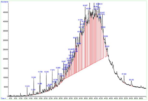 As shown in the table, it was found that the essential oil yield depends on the type of raw material and the temperature of the working steam. The obtained data were fully compared with the condition of complete distillation. As the temperature increases, the essential oil yield decreases in this condition (see Figure 1), while other components begin to caramelize, resulting in a sharp increase in the release of monoterpenes. The distillation of essential oil was carried out from both fresh and dried raw materials. At temperatures ranging from 100˚C to 130˚C, the essential oil yield increased, with a slightly higher increase observed in juniper leaves. As the temperature rose (at 180˚C and 200˚C), the essential oil yield decreased, which is explained by the intensified oxidation and polycondensation changes of terpenoids, transforming them into resinous products. The essential oil yield obtained from J. communis was 2.1% at 187˚C. With an increase in the working steam temperature, the rate of essential oil separation from the raw material gradually increased, meaning the oil release started in the range of 150–187˚C.