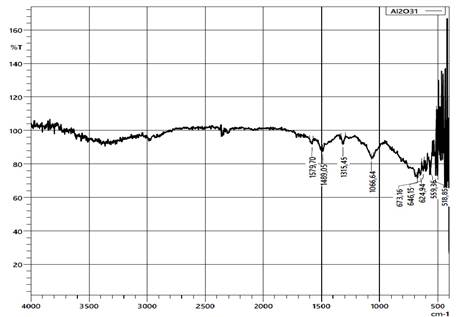 По оси X отложены волновые числа (см⁻¹), а по оси Y – процент пропускания. Основные пики: 1579.70 см⁻¹, 1489.95 см⁻¹, 1315.45 см⁻¹ – возможны колебания примесей или дефектов в структуре Al₂O₃, 1066.64 см⁻¹ – возможно, связаны с колебаниями Al-O, 673.15 см⁻¹, 645.16 см⁻¹, 629.45 см⁻¹, 594.93 см⁻¹, 518.85 см⁻¹ – характерные пики для Al₂O₃, относящиеся к колебаниям Al-O. Этот спектр подтверждает состав и структуры Al₂O₃, а также возможные примеси.