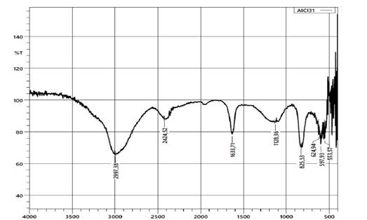 ИК-спектр полихлорида алюминия подтверждает его полимерную природу, сочетая колебания Al-Cl, Al-OH и Al-O. Основные отличия полиалюминия хлорида от Al₂O₃, в спектре – наличие интенсивных полос O-H (3400 см⁻¹-2997.38 см⁻¹) и H-O-H (1633-1650см⁻¹), свидетельствующих о гидролизе. Ослабление и расширение полос Al-Cl, что указывает на образование полимерных структур. 1100–1000 см⁻¹ – растяжения Al-OH, характерные для гидролизованных алюминиевых комплексов, 850–600 см⁻¹ – растяжения Al-Cl, определяющие основные связи в полиалюминия хлорида, 500–400 см⁻¹ – колебания Al-O, характерные для оксидных форм алюминия.