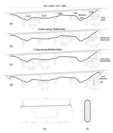 Figure 1. Longitudinal sections of the bridge systems compared due to their cost-effectiveness: (a) the “reference” real bridge located in the Arahthos-Peristeri region, (b) the “floating deck” bridge, (c) the semi-integral bridge, (d) the fully-integral bridge and (e & f )cross sections of the deck and the pier