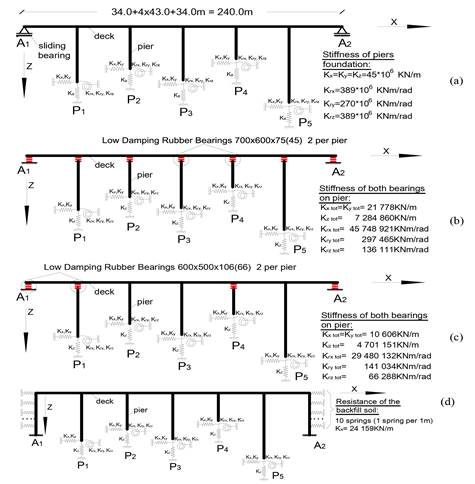 Figure 2. The model of: (a) the reference bridge, (b) the “floating deck” bridge, (c) the intermediate robust bridge and (d) the integral bridge.