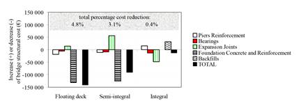 The “floating deck” bridge alternative seems to be competitive to the structural cost of integral systems. However, the high maintenance cost of such bridge systems is underlined as an inevitable disadvantage of the “floating deck” bridge [24].