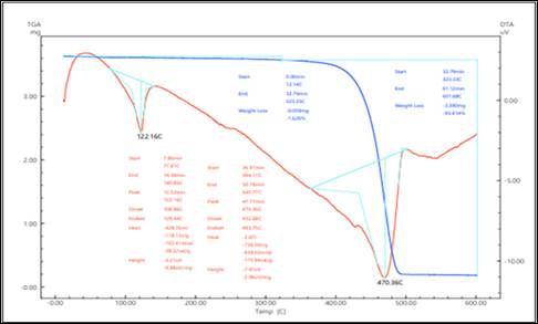 Анализ кривой термогравиметрии (TGA) показывает, что кривая TGA достигается в двух температурных диапазонах интенсивного разложения. Диапазон распада 1 произошел в диапазоне температур 12,14–323,33оС – было обнаружено, что 0,059 мг, или 1,626 %, потеряли массу. Однако при распаде 2 в температурном диапазоне 3390 мг или 93,414 % потери массы произошло 323,33–601,68 оС. 12,14–601,68ºС интервал общего массирования составляет 3,449 мг или 95,04 %, а время массирования составляет 81,12 мин.