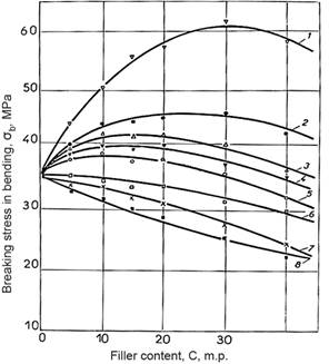 However, the magnitude of the breaking stress during bending remains quite high for compositions filled with up to 15-20 m.p. including talc, kaolin and up to 5-10 m.p. including soot and graphite.
