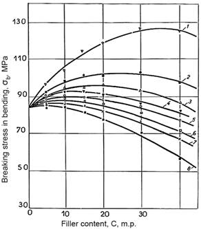 A further increase in the content of these fillers is accompanied by a gradual decrease in the values of breaking stress during bending. When mineral ingredients such as talc, kaolin and, especially, carbon-graphite fillers - soot and graphite are introduced into polypropylene and high-density polyethylene, the breaking stress during bending decreases with increasing their content.