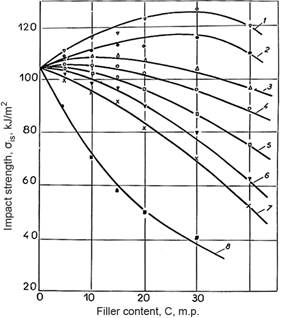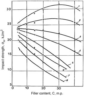 1 - fiberglass, 2 - cotton lint, 3 - wollastonite, 4 - chalk, 5 - kaolin, 6 - talc, 7 - graphite, 8 - soot Figure 4. Dependence of the impact strength of composite polymer materials based on polyethylene on the type and content of fillers |