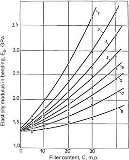 1 - fiberglass, 2 - cotton lint, 3 - wollastonite, 4 - chalk, 5 - kaolin, 6 - talc, 7 - graphite, 8 – soot Figure 6. Dependence of the elastic modulus in bending of composite polymer materials based on polypropylene on the type and content of fillers |