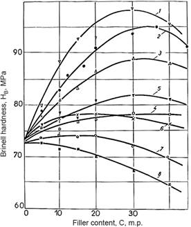 1 - fiberglass, 2 - cotton lint, 3 - wollastonite, 4 - chalk, 5 - kaolin, 6-talc, 7 - graphite, 8 - soot Figure 5. Dependence of the Brinell hardness of composite polymer materials based on polypropylene on the type and content of fillers |