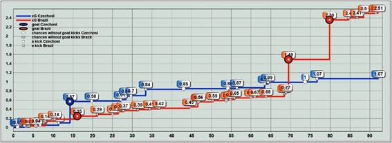 Brazil played more aggressively, although most attacks did not pose a serious threat to the opponent's goal (Figure 2). Their final xG advantage (2.51 vs 1.07) is primarily explained by two mistakes from the Czechoslovak goalkeeper. Otherwise, the match remained evenly balanced.