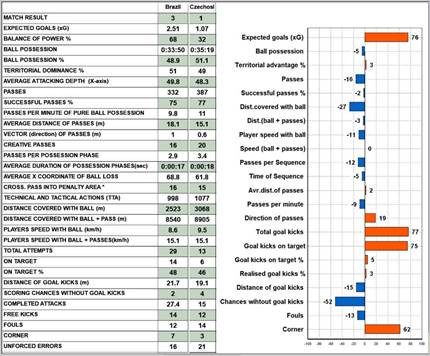 Brazil advanced more aggressively, with their 1.0 m pass vector (vs 0.6 m) indicating quicker attacking transitions. The Europeans covered 545 more meters with the ball (3068 vs 2523) at higher speed (9.5 km/h vs 8.6). Czechoslovakia committed five more unforced errors (21 vs 16), partially explaining defensive lapses (Figure 3). This proved decisive in an otherwise balanced match.