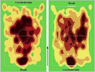 Notably, Brazil barely utilized flanks (Figure 4) despite Garrincha's presence, though their first two goals originated from left-wing attacks. Meanwhile, Czechoslovakia predominantly attacked through their right flank, making their play predictable. Both teams' organized defenses forced opponents into long-range attempts.