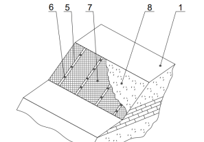 1- Working platform of open cut slope; 2- Inclined hole; 3-Slope surface; 4-Crashing zone; 5-Fittings; 6- Detents; 7-Metal lath; 8-Strengthening solution layer