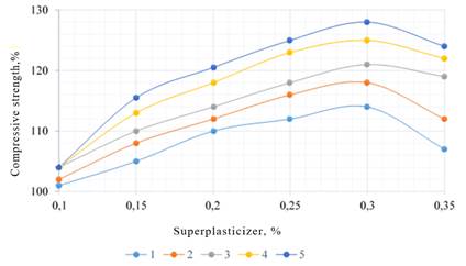 - Positive effect of SP content passes through a maximum, based on this, it can be stated that optimal dosage of the plasticizer is 0.3% of cement content.