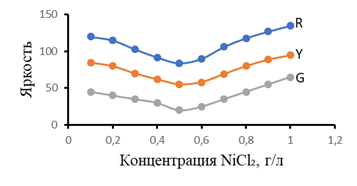 Рисунок 2. Воздействие никельсодержащих солей на интенсивности R-, Y-, G -оттенков в исследуемых образцах