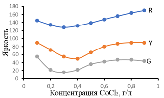 Рисунок 3. Воздействие кобальтсодержащих солей на интенсивности R-, Y-, G -оттенков в исследуемых образцах