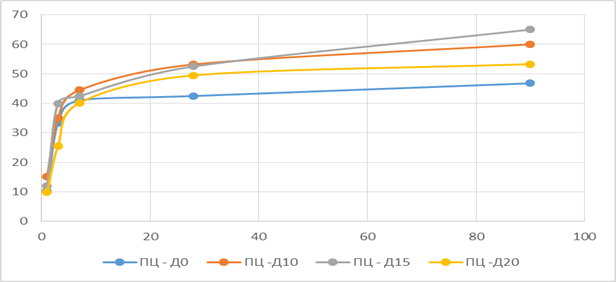 В соответствии с данными этой таблицы, 15 %-ное количество АЗШС способствовало повышению прочности цемента по сравнению с ПЦ-Д0 во все сроки. При добавке 20 % АЗШС прочность образцов добавочного цемента в начальный период твердения (2–7 суток) несколько снижается, однако, формирующийся в процессе гидратации в системе «молотый клинкер – АЗШС – гипс – вода» цементный композит постепенно уплотняется и к 28-суточному сроку твердения его прочность стала даже выше (рис. 3), чем у ПЦ-Д0. Добавочные цементы, содержащие до 20 % АЗШС, соответствовали всем требованиям ГОСТ 31108.