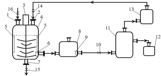 1 – Raw material inlet nozzle, 2 – Absorbent inlet nozzle, 3 – Stirrer, 4 – Microwave extractor 5 – Wave-emitting device, 6 – Filter, 7 – Residue outlet nozzle, 8 – Vessel (container), 9 – Filter 10, 14, 15, 16 – Valve (tap), 11 – Fractionating vessel, 12 – Semi-finished product collection vessel, 13 – Absorbent