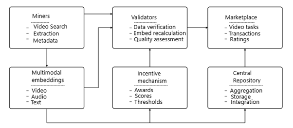 - Decentralized data collection network (miners): automated agents that search, download and pre-process video content from public platforms. Each miner accompanies the video with metadata (titles, tags, descriptions) and ensures the diversity and novelty of the data.