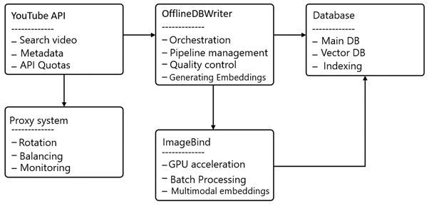 The Writer module (see Figure 2) is a comprehensive offline pipeline for automated collection, processing, and storage of video content. The architecture is focused on scalable processing of large volumes of data while ensuring high-quality results. The system is based on the integration of modern machine learning methods, efficient resource management, and strict quality control at each stage of the video life cycle — from search to final storage.