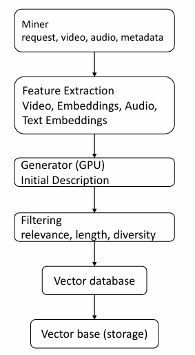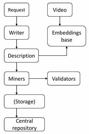 The system (see Figure 3) is built around a decentralized network of miners that perform automated collection of video content from public platforms based on pre-defined or dynamically generated search queries. Each miner accompanies the video with metadata: titles, tags, descriptions, timestamps, as well as additional information necessary for subsequent filtering and analysis.