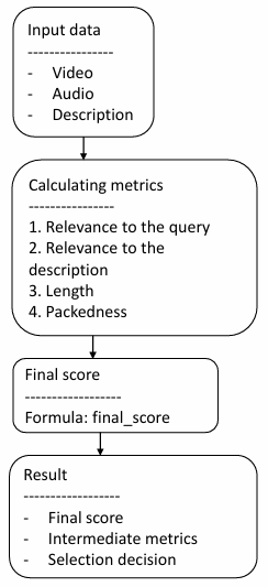 The framework implements an end-to-end processing pipeline — from video segmentation and embedding extraction to description generation, filtering, scoring, and final assembly. Particular attention is paid to fragment selection mechanisms, which range from simple heuristics to global optimization methods. Quality assessment metrics provide an objective assessment of the generated texts, and offline testing allows monitoring stability during model updates.