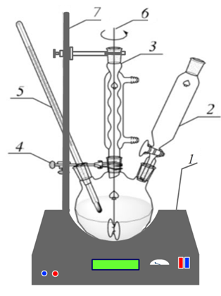 1-oil bath; 2-funnel; 3-reverse water cooler; 4-clamp; 5-thermometer; 6-mixer; 7-stand.