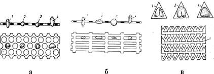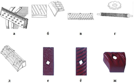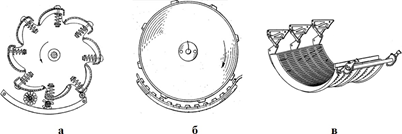 С.А. Вильям запатентовал деку для дробильных цилиндров (рис. 3, б). Эта дека отличается от других дек тем, что оснащена специальными зубчатыми зубьями. Однако в деках с такими зубьями увеличивается и травмирование зерна. Усовершенствованная дека была разработана и запатентована К.Р. Шенком (рис. 3, в).