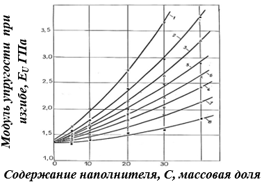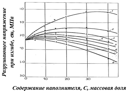Однако величина разрушающего напряжения при изгибе остается доволь¬но высокой у композиций, наполненных до 15-20 массовая доля талька, каолина и до 5-10 массовая доля сажи и графита.