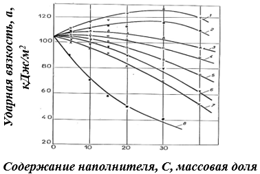 Ударная вязкость композиционных материалов на основе полипропилена с увеличением содержания стекловолокна, хлопкового линта и волластонита до 30 массовая доля, мела до 10-15 массовая доля также повышается, а затем снижается. При введении других наполнителей значение ударной вязкости постепенно снижается с увеличением содержания наполнителей (рис.2).