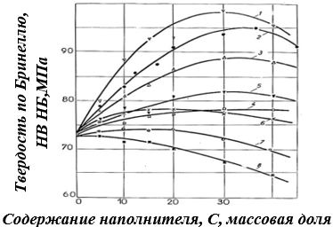 Твердость по Бринеллю композиционных полипропиленовых материалов (рис. 3) с введением стекловолокна, линта, мела, каолина до 30 массовая доля, талька, сажи и графита до 10-15 массовая доля повышается, а затем снижается.