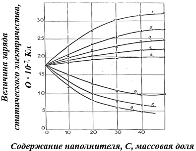 Наполнение композиции графитом и сажей вызывает сильное снижение величины заряда статического электричества при трении их с хлопком-сырцом. Добавление талька, каолина, стекловолокна, хлопкового линта, мела в полипропиленовую композицию увеличивает величину заряда, а графита, сажи и волластонита - снижает. Это связано с различным действием минеральных наполнителей на электропроводность полимерных композиций. С ростом содержания минеральных наполнителей [3] проводников и полупроводников повышается число контактов между частицами, увеличивается поверхность контактов. В результате этого растет электро- и теплопроводность композиционных полимерных материалов. Рост содержания талька и каолина также вызывает усиление контактов между частицами наполнителя, однако это приводит к некоторому повышению электрического сопротивления и снижению теплопроводности КМ.