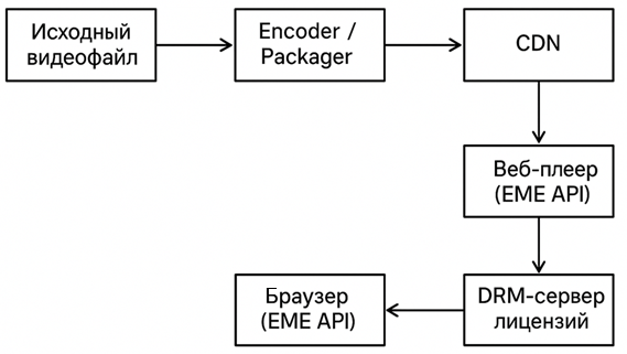Техническая интеграция систем DRM в веб-плееры — задача высокой сложности, требующая комплексного знания стека протоколов и стандартов. В частности, речь идёт об адаптивном стриминге по HTTP (MPEG-DASH, HLS), единых схемах шифрования (CENC) и браузерных API для обработки зашифрованного медиапотока (EME). Каждый элемент этого набора обладает собственными спецификациями и ограничениями, что серьёзно усложняет разработку кросс-браузерных и кросс-платформенных решений.