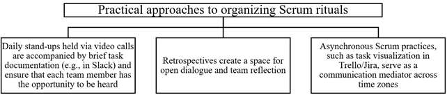 Thus, the conducted study confirmed the significance of Scrum rituals as a tool for improving intra-team communication in international projects. Scrum rituals represent the systemic mechanisms within the Scrum methodology aimed at establishing regular, predictable, and effective channels of interaction. The main forms of Scrum rituals include daily stand-ups, planning sessions, demonstrations, and retrospectives; these forms serve as tools for both management and communication, the proper tuning of which enables the creation of a trusting environment, reduction of barriers, and enhancement of transparency and efficiency in intra-team interactions. International projects impose specific communication requirements related to overcoming sociocultural differences and the asynchronicity of interactions. Scrum, due to its structure, is capable of mitigating these challenges and acting as a mechanism for unifying and coordinating project activities. The proposed model for effective organization of Scrum communication in international projects is based on a combination of synchronous and asynchronous interaction levels, the use of digital visualization tools, role duplication, and facilitation of team collaboration.