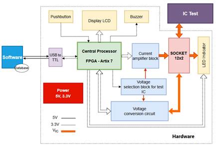 Central processor: Contains a program logic processor for controlling and processing data from the test IC, with the primary function: receiving encoded data from the software, decoding and then deploying signals to the IC pins, receiving the IC output signal and encoding it to the computer, controlling other blocks in the system such as: amplifier block, voltage selection block, LCD and buzzer, ... supporting flexibility and customizing IC pin configuration as required.