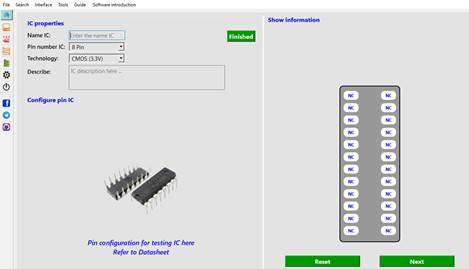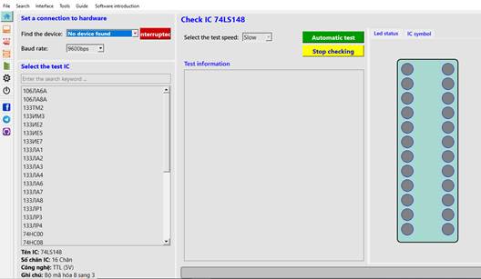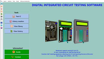 The user selects available tests corresponding to the ICs they want to test, or they can create a library for a new IC. The library creation process is intuitive through the button press to select the logic state at each pin of the IC. The tests will be encoded and then packaged into a database corresponding to an IC. The software sends encoded signals to the hardware and receives results from the hardware, then compares them with the created library and detects errors.