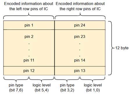Encoding the logic level of the IC pin uses bits 5, 4 for the left pin row and bits 1, 0 for the right pin row: