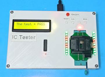 - The peripheral device reports the test progress on the LCD screen, and the LED shows the corresponding logic status at each pin of the IC.