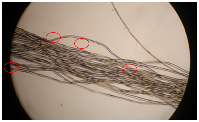 На микроскопических изображениях, представленных ниже, красные окружности обозначают наличие изгибов или текстурных элементов. Отсутствие красных окружностей свидетельствует об отсутствии текстурирования или переплетения филаментов в исследуемой нити.