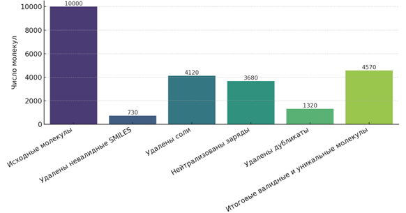 В качестве обучающего и тестового набора данных использовалась открытая база данных ZINC. Молекулы были представлены в формате SMILES и предварительно обработаны с использованием библиотеки RDKit: удалены соли, нейтрализованы заряды, устранены дубликаты и химически некорректные структуры [8-10].