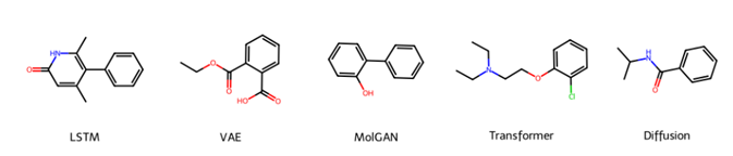 Рисунок 2. Примеры молекул, сгенерированных каждой из моделей: LSTM, VAE, MolGAN, Transformer и Diffusion