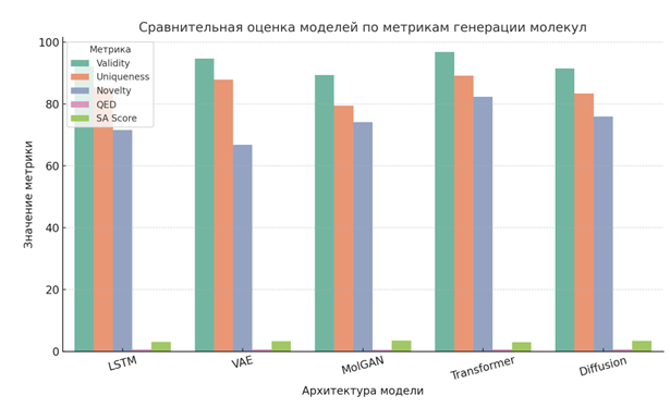 В ходе настоящего исследования был проведён сравнительный анализ пяти архитектур нейросетей, применяемых для генерации химических соединений с потенциальной биологической активностью: LSTM, VAE, MolGAN, Transformer и диффузионной модели. Все модели были обучены на едином наборе данных и оценены по ключевым метрикам генерации - валидности, уникальности, новизне, QED и синтетической доступности.