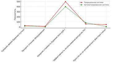 На графиках видно, что 5 из 5 показателей лучше у автоматизированной системы, а эффективность на 17,2% выше у традиционной системы. Таким образом, автоматизация процессов строительства нефтяных скважин является ключевым направлением развития нефтегазовой отрасли.