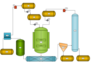 Абсолютный ацетон (поз. 1) через дозатор (поз. 2) поступает в растворительный бак (поз. 3), где используется для растворения фенола. Полученный раствор фенола направляется через дозатор (поз. 6) в реакционный аппарат (поз. 7), оснащённый мешалкой и системой терморегулирования.