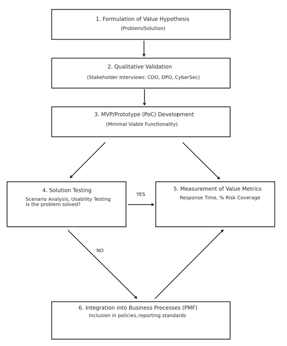 Первоначальная гипотеза разработки ПКБ опиралась на допущение о существовании потребности у профильных экспертов по кибербезопасности, управляющих данными (офис CDO) и специалистов по защите персональных данных (DPO) в едином аналитическом инструменте для оперативного выявления аномалий при взаимодействии с данными внутри КАП. В отличие от классической модели разработки, предполагающей сбор формализованных требований и последующий длительный этап кодирования, был избран адаптированный итеративный фреймворк. Он объединяет ключевые принципы Customer Development [3] и Value Proposition Design [10] с учётом специфики корпоративной среды и особенностей внутренних процессов организации, что схематично представлено на рисунке 1.