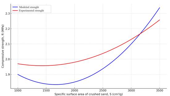 As a result of calculations, the determination coefficient (R² ≈ 0.97) indicates a strong nonlinear relationship, consistent with the quadratic model. Consequently, as the specific surface area of the ground sand increases, the compressive strength of aerated concrete also increases.