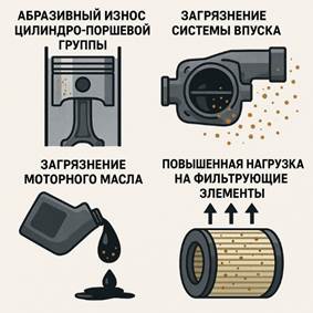 Работа двигателя внутреннего сгорания в условиях высокопылевой среды сопровождается множеством деструктивных процессов, которые затрагивают как воздухозаборную систему, так и элементы цилиндро-поршневого узла, турбонаддув, систему смазки и даже систему охлаждения. Пылевые частицы, проникающие через фильтрационные барьеры, оказывают прямое физико-химическое и механическое воздействие на поверхности деталей, находящихся в постоянном движении и под высоким давлением и температурой.
