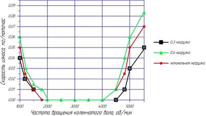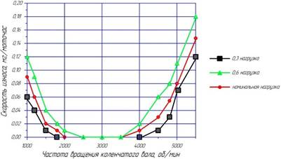 Рисунок 3. Зависимость скорости износа цилиндро-поршневой группы двигателя от частоты вращения коленчатого вала при различных уровнях нагрузки в условиях повышенной запылённости воздушной среды (концентрация пыли до 80%)