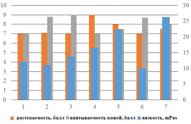 Хотя количество масла в рецептах кремов одинаково, физико-химические свойства масел напрямую влияют на свойства крема. Поэтому были проанализированы вязкость, растекаемость и впитываемость кремов кожей. Полученные результаты представлены на рисунке 1.